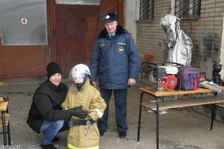 с большим восторгом примеряла на себя «боевую» одежду пожарного, с интересом